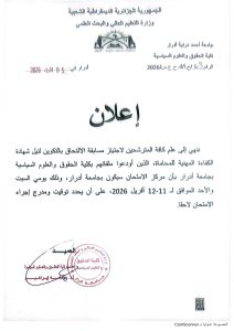 الإعلانات إعلان هام لفائدة المترشحين لإجتياز مسابقة الألتحاق بالتكوين لنيل شهادة الكفأة المهنية للمحاماة By othmani On أبريل 7, 2026 0 3 Share 0 3 Share
